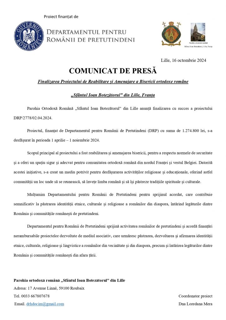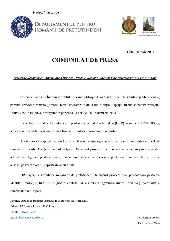 Cu binecuvântarea Înaltpreasfințitului Părinte Mitropolit Iosif al Europei Occidentale și Meridionale, parohia ortodoxă română „Sfântul Ioan Botezătorul” din Lille a obținut sprijin financiar pentru proiectul DRP/2778/02.04.2024, desfășurat în perioada 01 aprilie – 01 noiembrie 2024.